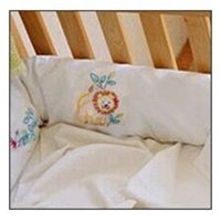 A standard size bumper pad can be inserted through the envelope style opening at the center of the cover. The cover has ties on both the top and the bottom edges to hold it firmly in place. Ties are spaced approximately 21 inches apart. Six assorted motifs embroidered on percale in the George Collection. Bumper pad sold separately.